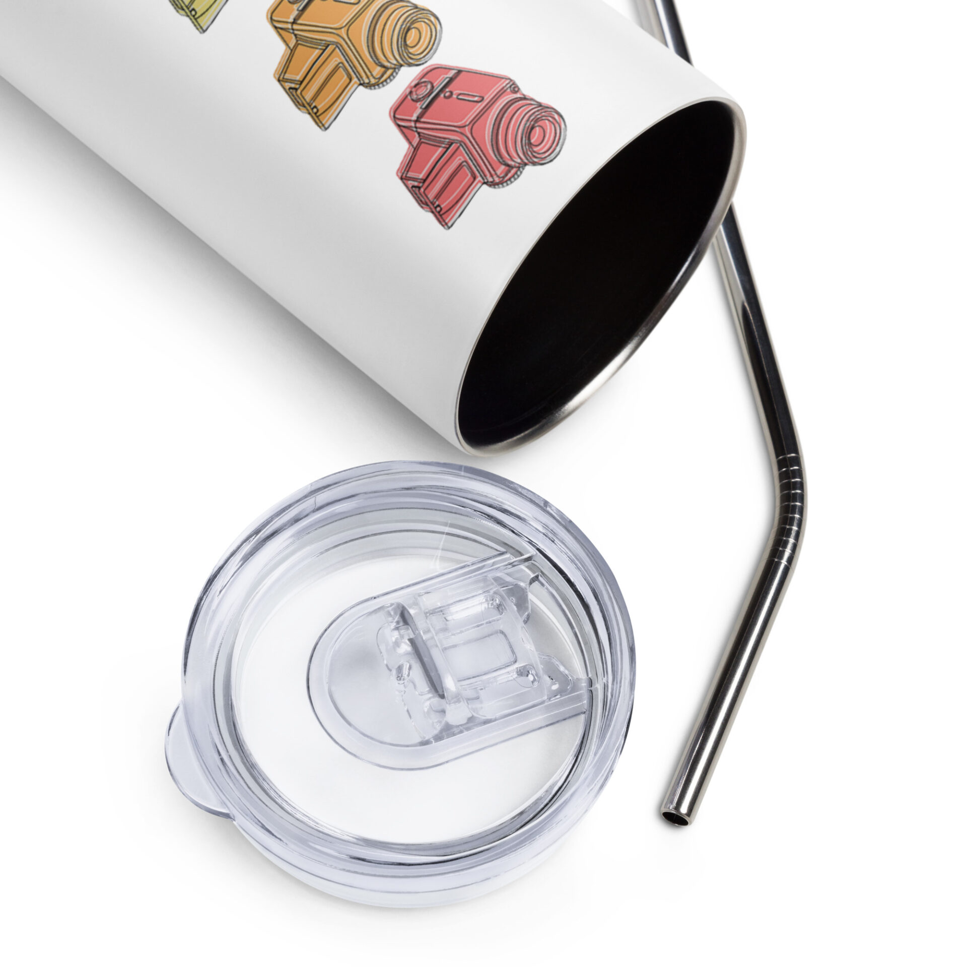 Made with high-quality materials, this tumbler boasts a classic design that is both stylish and unique. The vibrant rainbow colors and retro camera graphic make a bold statement that is sure to turn heads.